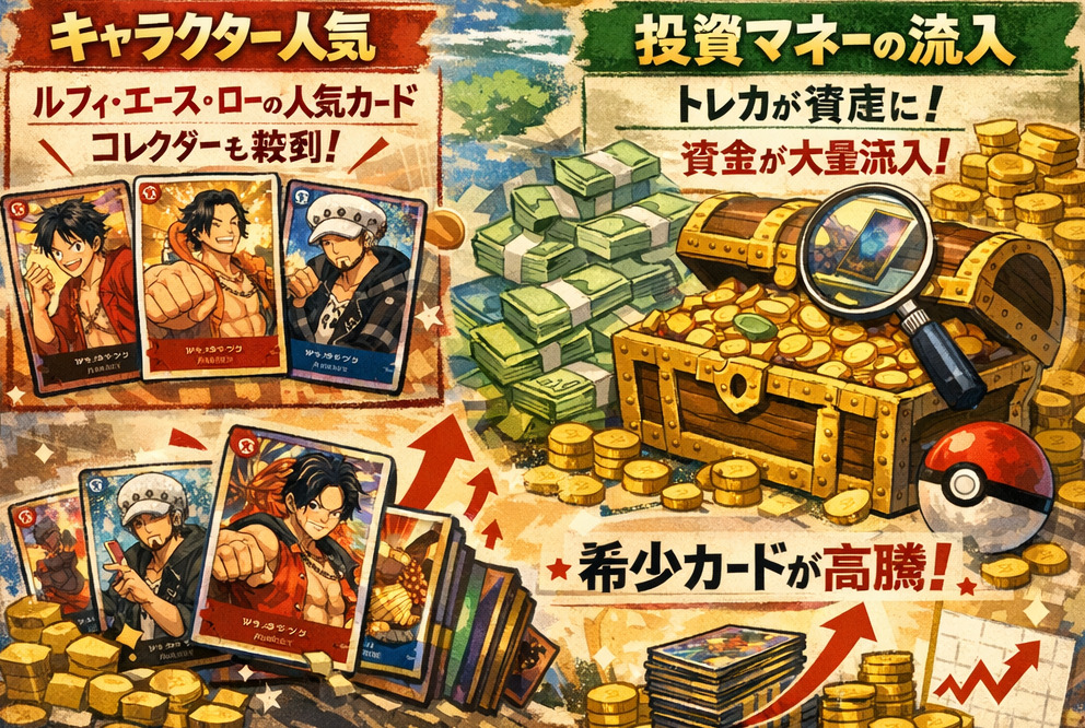 そして見逃せないのが「投資マネーの流入」です。ポケモンカードの成功事例を背景に、トレカ=資産という認識が広まり、ワンピースカードにも大量の資金が流入しました。